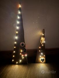 Alberi di natale fatti con legno vecchio,stoffa e luci a pile. 45€ il grande 35€ il piccolo