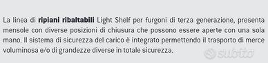 Una delle peculiarità che rende la linea Light Shelf particolarmente funzionale per l'allestimento furgoni è la possibilità dichiudere totalmente i ripiani, così da poter caricare e trasportare anche oggetti voluminosi posti su europallet.