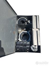 ALLINEATORE A GANASCE Fusion Equipment PER TUBI MISURA COLLARI 63 75 90 110 125 140 160 180 MM. SI PUò UTILIZZARE PER SALDARE DRITTO, A 45° , 90° USATO, COMPLETO DI CASSETTA IN METALLO, 2 CHIAVI PER L' ASSEMBLAGGIO, IMPUGNATURA IN PLASTICA DI UN VOLANTINO DI STRINGIMENTO DI UNA GANASCIA ROTTO, MA FUNZIONANTE LO STESSO. FACILE DA SOSTITUIRE CON UNA IMPUGNATURA NUOVA , MA NON NECESSARIA PER IL NORMALE UTILIZZO.