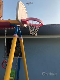 Scivolo con altalena Chicco attrezzata con tavoletta seggiolino chiuso disco e anelli, lateralmente viene applicato canestro da basket Misura altelena 240x210 larghezza scivolo 60. No spedizione