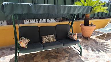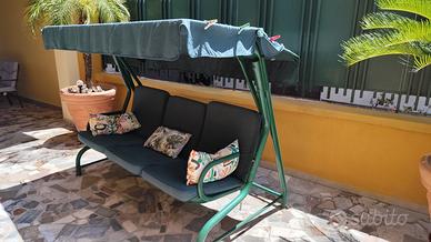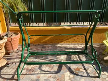 Altalena in ferro, ideale per giardino e terrazzo. Si tratta di una struttura perfettamente dondolante e non danneggiata con segni di usura vernice. La struttura diventa nuova se verniciata. Cuscini seduta in ottimo stato. Misure: Altezza Mt. 1,55. Larghezza MT 2.0. Profondità MT. 1,20 .