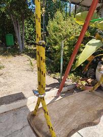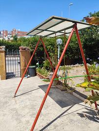 Altalena modificata, con copertura contro sole ed pioggia, corde VELICHE, bulloni INOX NAUTICA, piedi di sostegno modificati per un migliore appoggio, e possibile fissarla a terra. Di meglio non si può fare.