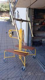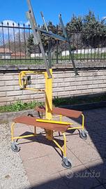 Permette il caricamento della lastra “da terra”. Per il trasporto e la messa in opera delle lastre in cartongesso, del controsoffitto su superfici piane o inclinate.Utilizzabile da una sola persona. Facile scorrimento manuale dell’alzalastre grazie ad una comoda maniglia. Equipaggiato di 2 piattaforme alla base di 1 m x 0,30 m di 28 mm di spessore, posizionabile a 50 cm da terra. Base di appoggio per la lastra: m 2,4 x 1 m. Scorrimento su 4 ruote, di cui 2 dotate di fermo ruote con diametro 125 mm che facilitano lo spostamento sul cantiere. - Dimensioni in cm: 110 x 130 - H= 145 - Peso utensile: 45 Kg - Altezza operativa max. a soffitto (orizzontale): 3,50 m (4,00 m con prolunga) - Altezza operativa max. a parete (verticale): 3,90 m (4,40 m con prolunga) - Carico max. applicabile: 55 kg - Alzata con prolunga - N° Max lastre cartongesso posizionabili: 1