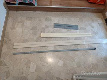 Alzatina e zoccolo per top cucina in alluminio. Misure: 1 alzatina lunga mt. 1,53 alta 2,5 cm - 1 zoccolo lungo mt . 1,86 alto cm 10 - 1 zoccolo lungo mt. 1,06 alto cm 10 - 1 zoccolo lungo cm 53 alto cm 12. Tutto acquistato da Leroy Merlin per la mia cucina questi sono parti rimaste con la pellicola protettiva perfette se possono interessare queste misure. Tutto a € 20,00 se richieste di pezzi singoli vediamo al momento. Non spedisco.