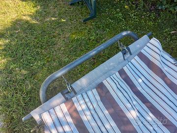 Amaca a dondolo, smontabile con sistema click, struttura in ferro verde, tessuto impermeabile a righe.