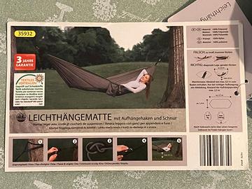 Amaca leggera da campeggio. Colore Army-green. Prodotto nuovo mai utilizzato e nella sua confezione originale.