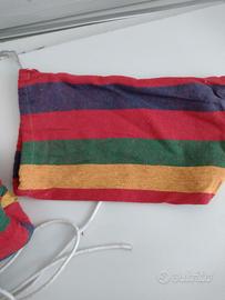 Amaca da campeggio/ giardino in cotone, 240 x 100, a righe colorate, con pratico sacchetto di chiusura. Vendo per inutilizzo. Utilizzato per una sola stagione, sempre smontato con pioggia! Come nuovo!