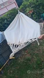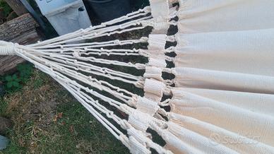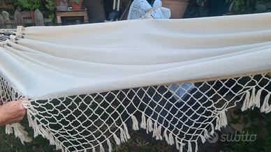 bellissima amaca in canapone molto robusto, nappe all'uncinetto fatte a mano . lunghezza 235cm più angoli , larghezza 140 cm . altezza nappe 35cm. color crema.
