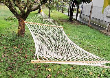 Grande amaca da giardino sospesa. Misure da anello ad anello di congiunzione m.3,30, larghezza m.1,20. Amaca mai usata, ancora con confezione originale aperta solo per fare le foto. Preferibile consegna a mani. Il disordine delle corde visibile in foto è dovuto al mancato utilizzo e alla confezione appena aperta.