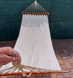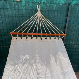 Vendesi amaca in tessuto color PANNA. Presenta normali segni d'usura; buono stato. Dotata di ganci metallici per il fissaggio.