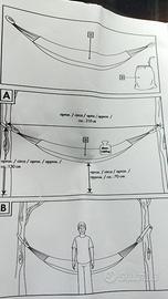 Amaca in tessuto nuova, con borsa di tela. Dimensioni 310x100 (superficie di appoggio 200x100). Carico massimo 150 kg. MAI USATA.