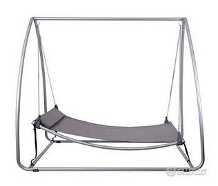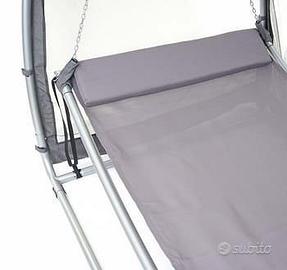 Amaca a dondolo con zanzariera in acciaio e textilene grafite con poggiatesta. Tessuto resistente ai raggi UV. Zanzariera traspirante con apertura tramite apposita zip. Portata max 110 kg. Sfoderabile e lavabile. Già smontata. Come nuova.