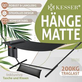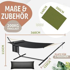 πππππ πππ πππ: Adatta rapidamente e facilmente la robusta amaca alle tue esigenze e approfitta del massimo comfort e flessibilitΓ sul tuo balcone o nel tuo giardino. Grazie alla superficie di riposo ampia e confortevole, cβΓ¨ spazio sufficiente per il relax per due persone. Il cuscino incluso garantisce un sonno riposante e confortevole.