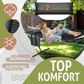 ππππ ππππππΓ π ππππππππππ: Due robusti ganci di qualitΓ consentono un fissaggio facile e intuitivo. Grazie al dispositivo di sospensione per carichi pesanti, puΓ² sopportare un carico fino a 200 kg. Un morbido tessuto in cotone, indicato per la pelle e traspirante garantisce il massimo comfort per ore di relax sulla nostra solida amaca.