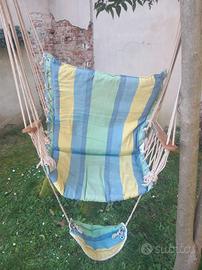 Vendo amaca - sedia a dondolo, in tessuto e corda, con braccioli in legno e poggiapiedi.