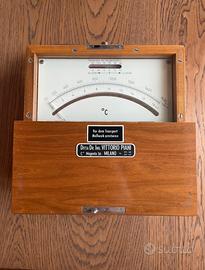 Strumento a bobina mobile immersa nel campo di un magnete. Quadrante con diverse scale di misurazione, inclusa scala celsius e scala millivolt.