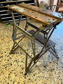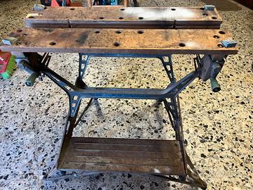 Black & Decker Workmate d’epoca, probabilmente anni ’60–’70, con struttura in ghisa, pedale di serraggio e piano in legno massello originale. È il tipo più ricercato rispetto ai Workmate moderni (che sono in lamiera).