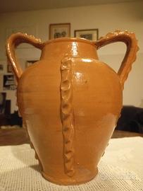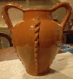 Il vaso presenta una lavorazione decorativa "a rilievo" lungo i manici e sui lati del corpo, tipica dell'artigianato artistico tradizionale. È un pezzo perfetto per arredamento rustico, shabby chic o come elemento di contrasto in un ambiente moderno.