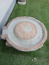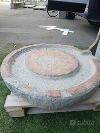 antica base per macina diametro 80 cm. altezza 12 cm . eta stimata coi I.A 150-250 anni. la colorazione rossa e una probabile stratificazione di lavorazioni.