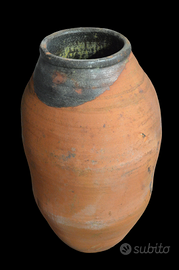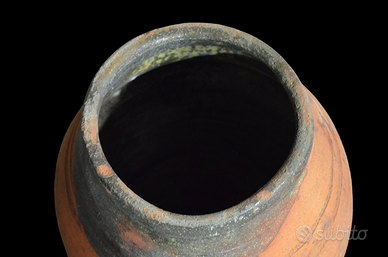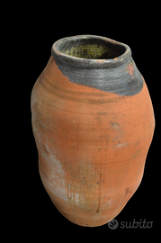 Antica giara dell'ottocento, utilizzata per contenere l'olio; presenta una forma irregolare molto caratteristica, che insieme alla bocca smaltata le conferisce un aspetto "artistico", che trasmette subito il senso della totale assoluta manualita' della sua realizzazione, molto in linea con il gusto odierno. Conservatasi con la struttura integra presenta lievi segni di usura dovuti all'età.