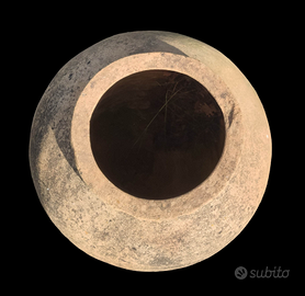 Antica giara del settecento, utilizzata per contenere l'olio; tipo di giara che veniva interrata parzialmente, da cui la sua forma particolare. Conservatasi con la struttura integra presenta ovvi segni di usura dovuti all'età.
