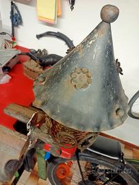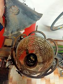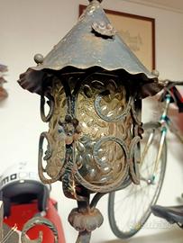 Stupenda lampada da giardino esterno ma anche interno, creata con maestria in ferro battuto molto robusta , impreziosito al suo interno con uno spesso vetro di murano in decorazione semi in venatura colore semi fume' , una vera chicca che andrà ad impreziosire ed illuminare il vostro spazio , ideale per taverne, locande, giardino antichi, palazzi importanti, entrate padronali, pub, arredo rustico o giardino e patio, ecc.