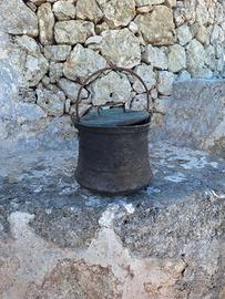 Vecchio pentolone, calderone in rame con coperchio Altezza 34 cm Larghezza 35 cm Altezza manico 22 Peso 6 Kg (circa) Particolare per arredare Ville, Case in Campagna, Giardini, Ristoranti, Antiche Dimore o Masserie Storiche.