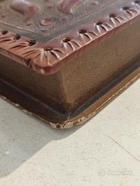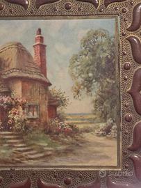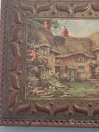 Elegante scatola antica, perfetta per conservare gioielli o ricordi preziosi. Presenta una decorazione raffinata con un'immagine di una casa di campagna. - Design decorato con motivo floreale e casa rustica. - Bordi lavorati con dettagli ornamentali.