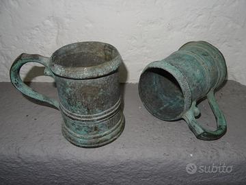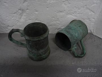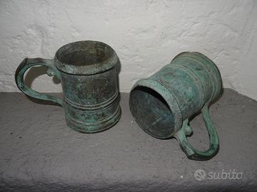 Antichi boccali in metallo ornamentali o da usare come piccoli vasi fioriere.