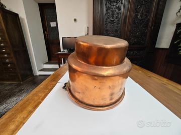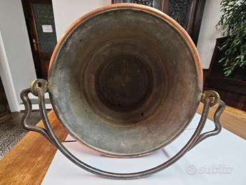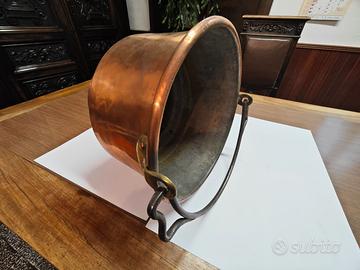 Antico paiolo o pentola in rame. Si tratta di un contenitore tradizionale, realizzato con il corpo in rame e dettagli come il manico o i supporti laterali in ottone o ferro battuto. Caratteristiche principali Materiali: Il corpo principale è in rame mentre il manico è in ferro con attacchi in bronzo, caratterizzato dal tipico colore caldo e da un'elevata conducibilità termica. Questo paiolo presenta una stagnatura interna per renderlo adatto al contatto con il cibo. Storicamente veniva utilizzato per cucinare a fuoco vivo su una tipica stufa a legna ad anelli sulla quale la parte inferiore di diametro ridotto veniva inserito. La particolarità di questo paiolo sta proprio nella differenza di diametro che ne aumentava la stabilità sulla stufa, per cucinare cibi come la polenta che necessita di un continuo rimescolamento. Uso Moderno: Oggi sono molto ricercati come oggetti da collezione o elementi d'arredo in stile rustico, "country chic" o "shabby country". Vengono spesso riutilizzati come cachepot (portavasi), portaombrelli o contenitori per la legna accanto al camino. Dimensioni totali: altezza 22 cm , larghezza 27 cm. altezza con manico 37 cm. circa. Peso: Kg. 2,150 circa. Lo vendo come pezzo da collezione o complemento d'arredo, integro e completo di ogni parte originale così come da galleria fotografica. Annessi segni del tempo che ne confermano l'autenticità.