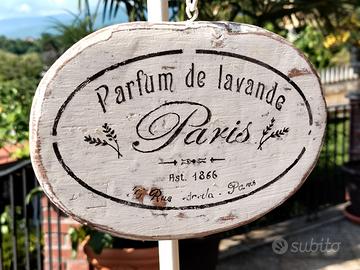 - Insegna Shabby Chic Paris - Parfum de Lavande su antica tavola in ciliegio appesa a catenella e sostegno a forma di cuore.