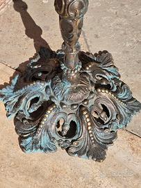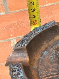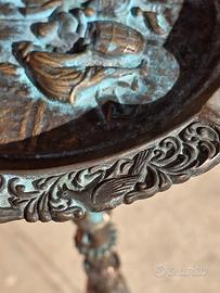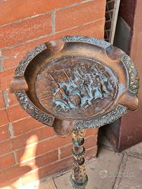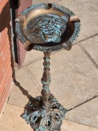 posacenere a piantana in bronzo o vasca per uccelli con decorazioni in rilievo. La patina originale suggerisce che il metallo si è ossidato nel tempo, Il posacenere presenta un design elaborato e ornamentale, con decorazioni a rilievo sulla coppa e sulla base intagliata. La base e l'asta sono riccamente scolpite.