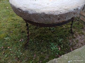 Tavolino creato con antica piastra in marmo su supporto di telaio in ferro. misura diametro 67 cm spessore 10 cm piastra altezza cm 60. caricabile a mano in auto.