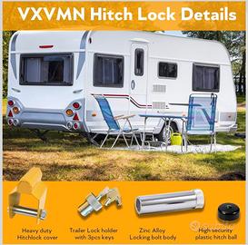 Blocco di sicurezza per gancio traino di roulotte o rimorchio, progettato per impedire il collegamento al veicolo e proteggere il mezzo da furti.