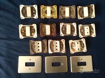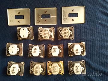 bticino serie DOMINO: interruttori, deviatori, pulsante, doppi deviatori, deviatore+pulsante, invertitore, prese 6 e 16 A con e senza polo di terra, prese bipasso, salvamuro, 3 placche in bronzo 1 posto e 2 a due posti . 3 euro a pezzo
