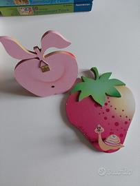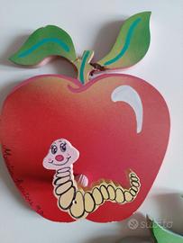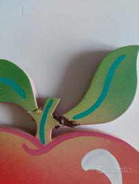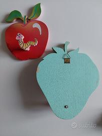 Appendiabiti in legno molti colorati in forma di mela con bruco e fragola con lumachina. La mela è stata rincollata nel punto della foglia come si evidenzia nelle fotografie. La mela (15x18cm) è poco più piccola della fragola. Sono in buono stato. Qualche pezzetto di colore è saltato. Sono made in Italy di Martin Pescatore Napoli