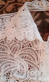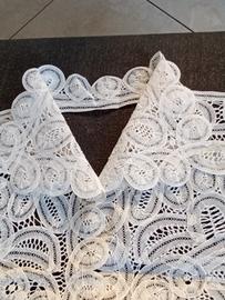 Sono tre applicazioni in pizzo di Bruxelles eseguite a punto rinascimento per completare il davanti di abiti o camicette.Furono acquistati negli anni'70 a Bruxelles, conservati nella busta originale e mai utilizzati.Due sono di cotone di colore bianco, il terzo è ecru,misurano cm.38 di larghezza spalle , cm.38 di lunghezza e 34 di giro collo. L'apertura anteriore si chiude con tre piccoli bottoni automatici.