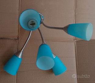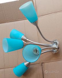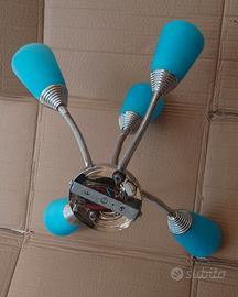 Applique in acciaio con 5 steli flessibili e coppette in vetro celesti. Mai usato ma senza confezione, tenuto in magazzino negozio-