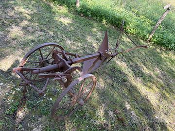 Vendo aratro antico in ferro, completo di ruote in metallo e parti originali.