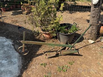 Metti le mani su un autentico aratro manuale in ferro, un pezzo solido e robusto dal fascino rustico, perfetto sia per utilizzo in piccoli appezzamenti che come oggetto da esposizione per arredamento agricolo o agriturismo.
