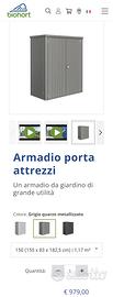 Vendo 2 armadi da giardino Biohort originali, completi di mensole e accessori. 💰 €500 cad. (nuovi circa €1000 l’uno) 📏 155 × 83 × 152 cm (L × P × H) • Struttura in lamiera zincata → non arrugginisce • Resistenti alle intemperie • Serratura con chiavi • Interno con mensole già montate Sono in ottime condizioni e pronti all’uso. 📍 Parma – ritiro a carico dell’acquirente Per il trasporto è sufficiente smontare le ante. Li vendo per cambio organizzazione spazi.