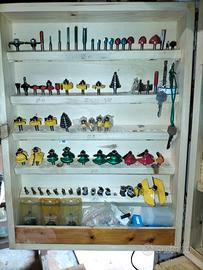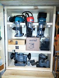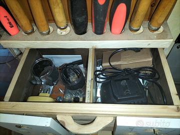 Armadietto per fai da te compreso contenuto interno ed esterno. in particolare un rifilatore Katsu a filo, un rifiltatore Katsu a batteria, un rifilatore Topshak a filo. O ltre 100 frese da 6, 6,35 e 8 mm. in tre confezioni + piu' quelle mostrate all'interno dello sportello dell' armadietto. Accessori per rifilatore compatibili per tutti i modelli indicati. Carcabatteria, guida parallela, copiatore, adattatori per uso di frese con codoli fa 6, 6,35 e 8 mm. Tutto quanto mostrato nelle foto. Il tutto in ottime condizioni, usato pochissimo. Le frese sono nuove (usate non piu' 5/6. Compreso quanto mostrato in foto (scalpelli da legno, dischi var per smerigliatrce angolare. Ritiro in zona mi