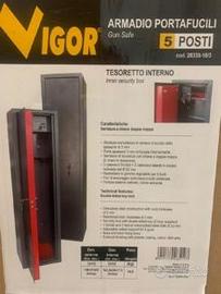 Armadio portafucili Vigor 5 posti in acciaio sp.mm.2 porta sp.mm.3 serratura a doppia mappa fori ancoraggio muro/pavimento altezza utile fucili cm.123,5 tesoretto interno peso kg.34,5 Larghezza cm: 34,000 Altezza cm: 142,000 Profondità cm: 24,000
