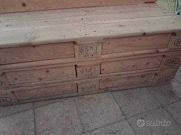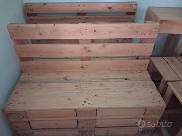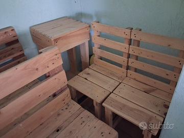 Vendo set da giardino in pallett costruzione artigianale 2 panche con schienale ,2 sedie,mobiletto appoggia bevande,2 panche da 6 posti 1 sedia seduta larga