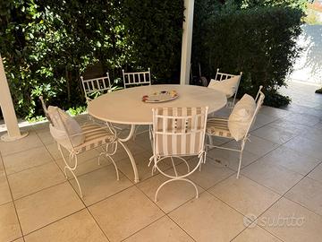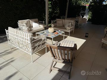 Vendo arredo da esterno composto da un tavolo ovale e 6 sedie in ferro verniciate bianche , tre divanetti due posti, un tavolino quadrato con piastrelle mosaico , incluso lampadario centrale e imbottitura cuscini . sdraio in legno escluso. Visibili a Cinquale.