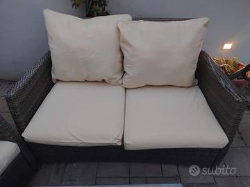 Vendo arredo giardino usato con circa 6-7 anni. Il set è composto da 1 divanetto 2 posti misure 133 x 75 cm circa 2 poltrone misure 70 x 75 cm circa 1 tavolino misure 90 x 55 cm Il set è di buona fattura, la struttura è di alluminio, quindi leggera e non arrugginisce. Mentre l'intrecciatura è di rattan sintetico. In alcune zone la plastica dell'intrecciatura è un po' rotta, i cuscini e le imbottiture sono in buone condizioni, le sedute non sono sfondate e in generale tutto il set regge ancora qualche anno. A disposizione per qualsiasi richiesta informazioni. Ritiro a carico del compratore, non ho i mezzi per trasportarlo.