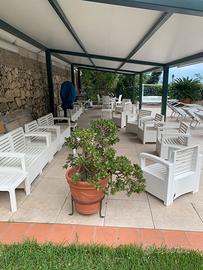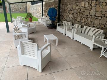 Vendo arredo giardino composto da n. 5 divanetti, n. 10 poltroncine, n. 3 tavolino, un carrello portavivande, n. 12 sedie con braccioli, n. 10 tavoli. Vendita in blocco €900. Per motivi di spazio gli arredi sono all’intemperie sotto un pergolato e quindi chi li acquista dovra lavarli.