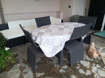 Tavolo , sedie e divano angolare 6 moduli in finto rattan +tavolino