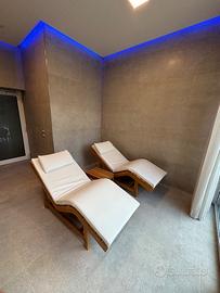 Vendo 4 lettini chaise longue, 2 tavolini un mobiletto sospeso tisaneria con lavandino, boiserie a parete ( tutto legno rovere massello fatto da falegname artigiano) e 4 materassini con cuscini fatti in pelle, come da foto allegate. Disponibile per info no perditempo. Praticamente mai usato.Prezzo poco trattabile no perditempo. Possibilità di fatturare.