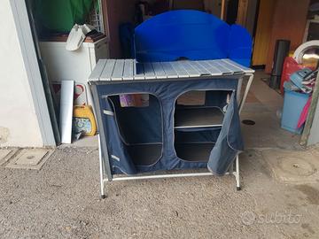 Vari prodotti per la maggior parte pari al nuovo.solo le 2 sdraio pieghevoli hanno 2 piedini aggiustati ma che non ne pregiudicano il funzionamento.tavolo completamente smontabile così come il mobiletto per il fornello e le 4 sedie richiudibile.